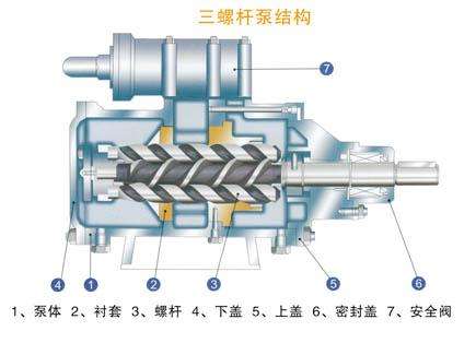 由于各螺桿的相互嚙合以及螺桿與襯筒內壁的緊密配合,在泵的吸 入口和排出口之間, 就會被分隔成一個或多個密封空間。隨著螺桿的轉動和嚙合,這些密封空間在泵的吸入端不斷形成,將吸入室中的液體封入其中,并自吸入室沿螺桿軸向連續地推移至排出端,將封閉在 各空間中的液體不斷排出,猶如一螺母在螺紋回轉時被不斷 向前推進的情形那樣,這就是螺桿泵的基本工作原理。